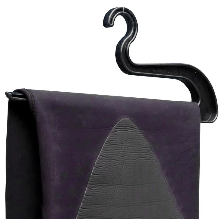 The SlideHanger is designed to eliminate shoulder wear and fatigue caused by shoulder hanging and significantly reduce overall fabric stress. The hanger slides into position, and the wetsuit drapes over the special circular/I-beam bar from the waist, eliminating shoulder wear and damage. The wetsuit dries fast; water only has to drip half as far. It’s also used to hang fishing vests, tactical vests, water sports vests, life vests, windsurfing gear and many other items. Beautifully made in the USA of rugged recycled materials.