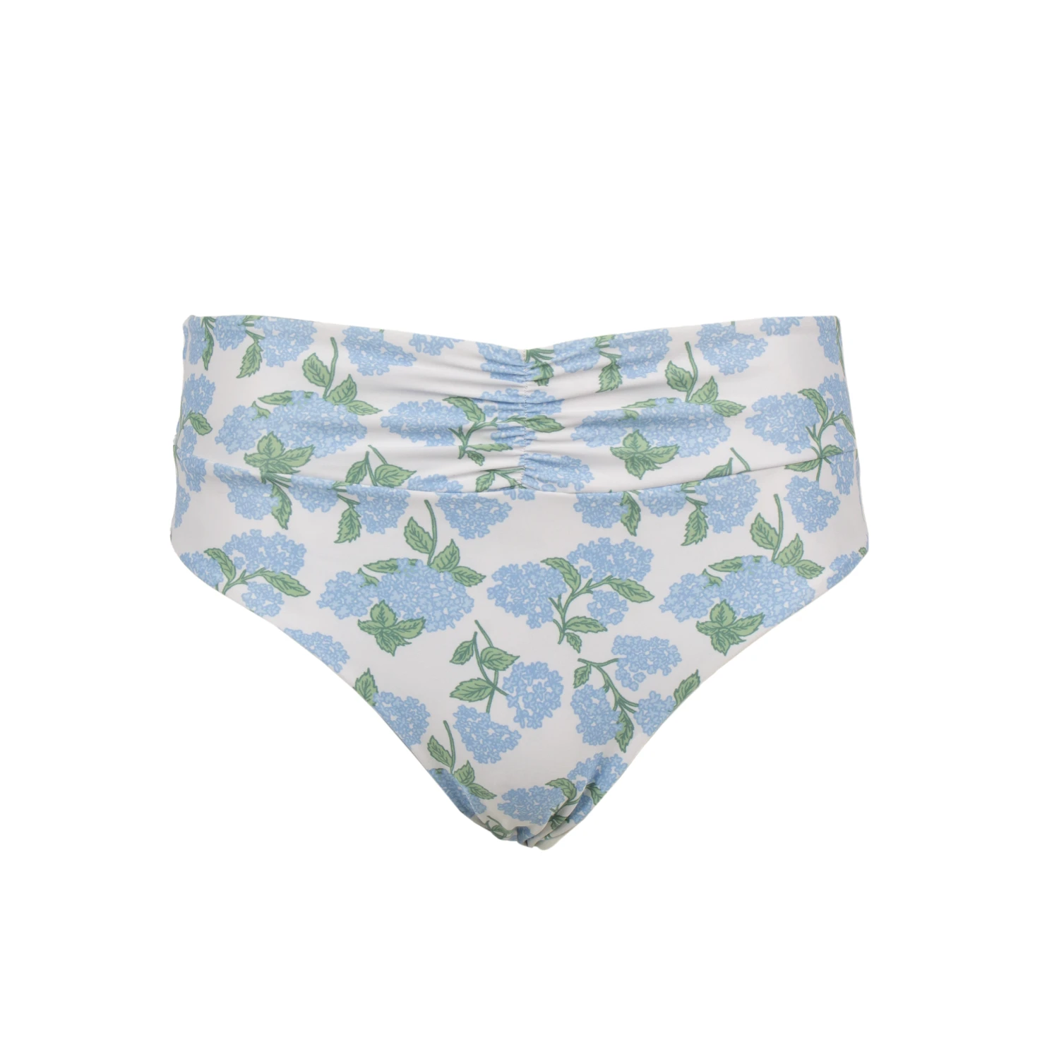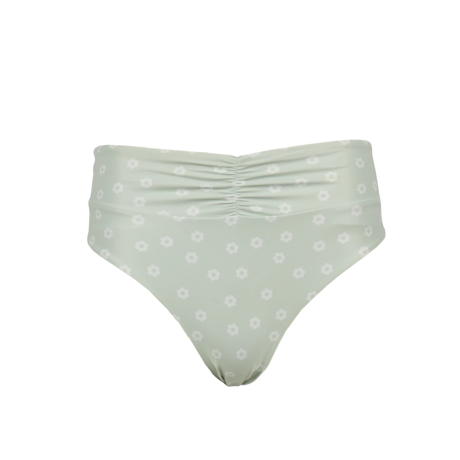 High waisted/ High cut swim bottoms with moderate coverage and ruche detailing on the front.Â